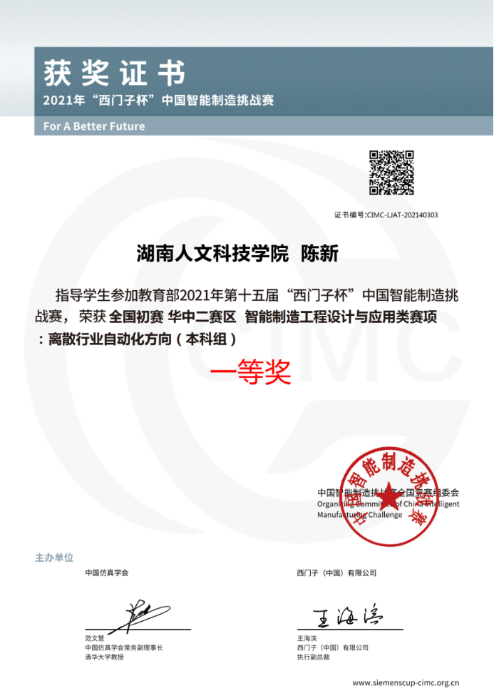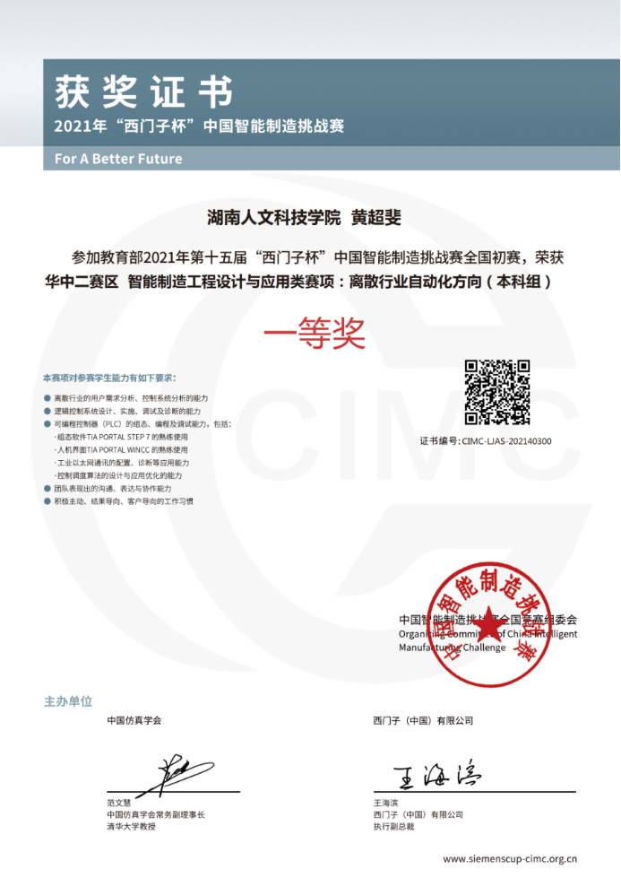 教育部2021年第十五届CIMC “西门子杯”中国智能制造挑战赛全国初赛于7月举行,本届初赛共有来自全国600多所高校16000余名师生参与。KY官网陈新教授指导的张志豪、陆海箜和黄超斐组成的“阳光大男孩”代表队荣获华中二赛区一等奖。