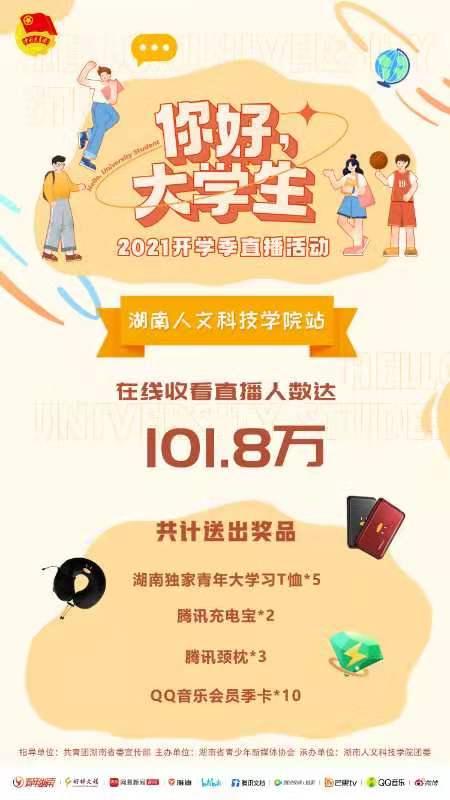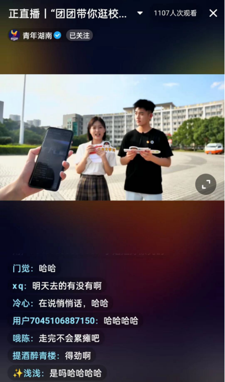 9月9日,由共青团湖南省委宣传部指导,湖南省青少年新媒体协会主办,KY官网团委承办的“你好,大学生”团团带你逛校园直播活动顺利进行。该活动在青年湖南、抖音、快手、B站、腾讯视频、网易湖南、芒果等多个平台同步直播。KY官网音乐舞蹈学院2018级学生李蕊和2019级学生邓启龙主持直播,带领新生和101.8万网民一起“云”游校园。