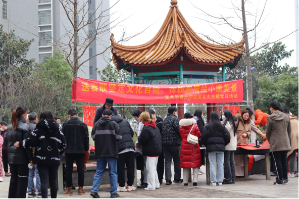 活动现场人声鼎沸、热闹非凡,吸引了越来越多的小区居民前来观看欣赏和领取春联。教工党员易俊、蒋传存、李国清的身边,更是围满了排队等待领取春联的居民。
