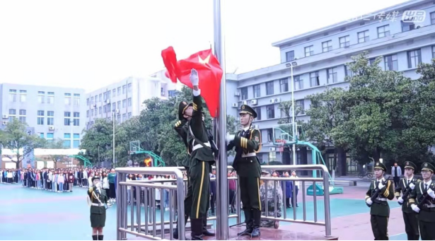 6:40升旗仪式正式开始。英姿飒爽的国旗护卫队踏着整齐的步伐护送五星红旗入场,全体师生奏唱国歌行注目礼,伴着庄严嘹亮的国歌,五星红旗冉冉升起。