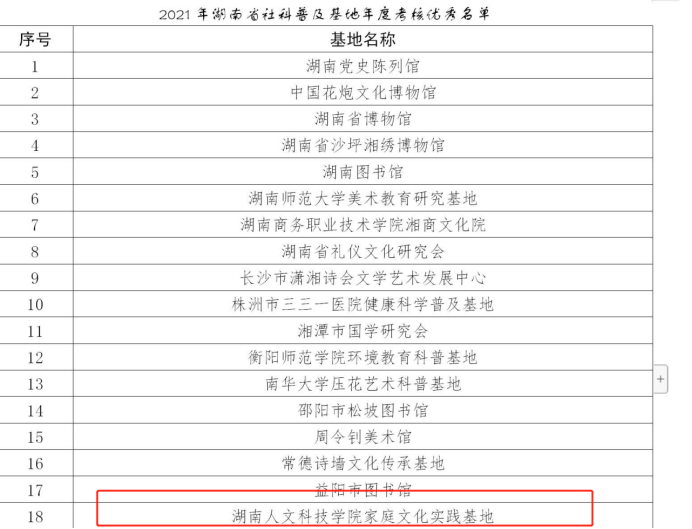 近期,根据湖南省社科普及基地年度考核结果公示,KY官网家庭文化实践基地从全省166家科普基地中脱颖而出,荣获省社科普及基地优秀奖。