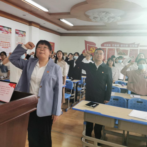 阳立新带领全体毕业生党员重温入党誓词。面对着鲜红的党旗,全体党员高举右臂,庄严宣誓,重温自己对党的誓言。