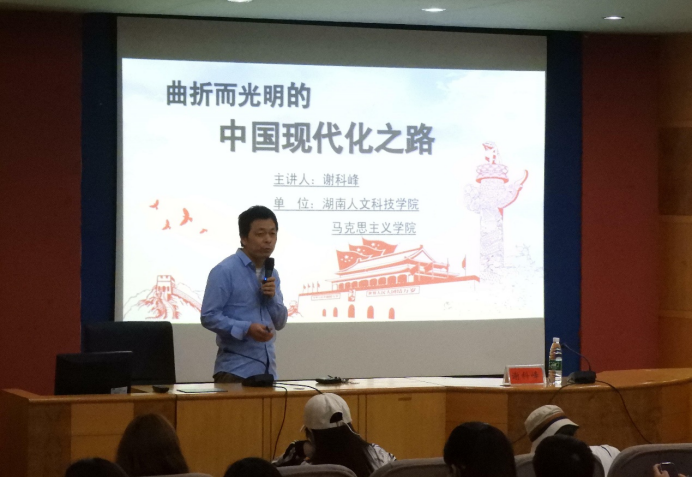 5月26日晚,马克思主义学院谢科峰博士于养根楼报告厅为第四期“青马工程”培训班学员开展题为“曲折而光明的现代化之路”主题讲座。
