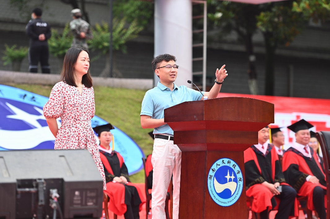 袁伟峰是2011届数金学院毕业生,赵为是2011届外国语学院毕业生。在毕业典礼上,袁伟峰与学弟学妹作了分享。他深情回顾了在学校学习的点点滴滴,感恩母校对他的培养。他坦言,从一个懵懂少年成长为坚定追梦的青年,并成就一番事业,离不开老师们的辛勤培养。他在事业有成时,能有机会回馈母校,既是感恩,也是祝福,真诚地希望母校越办越好,为国家、为社会培养出更多的优秀人才。他希望学弟学妹有一个奋斗的目标,敢于有梦、勇于追梦、勤于圆梦,做一个有担当的青年人,为学校发展、社会发展做出自己的力量。(校友办 供稿)