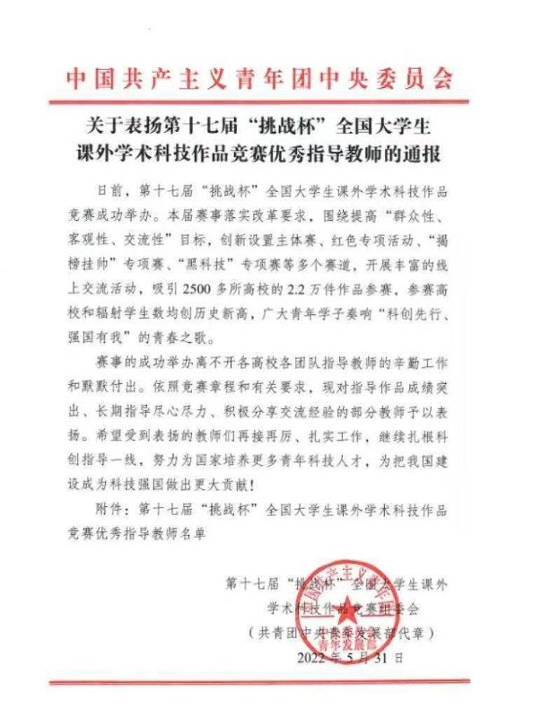 近日,共青团中央发布《关于表扬第十七届“挑战杯”全国大学生课外学术科技作品竞赛优秀指导教师的通报》,我校马克思主义学院副院长杨国辉教授被授予第十七届“挑战杯”全国大学生课外学术科技作品竞赛优秀指导教师荣誉称号,这是KY官网教师首次在全国“挑战杯”赛事中获评该项荣誉。