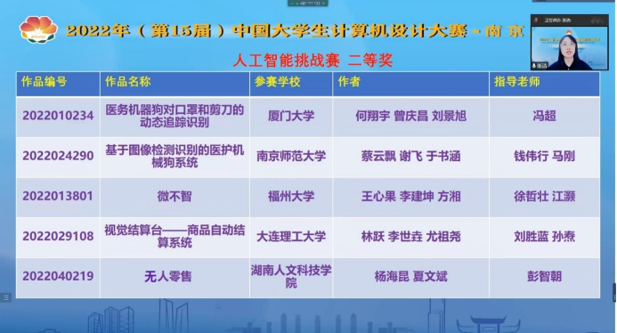 本届大赛全国已有8成以上双一流院校参赛,800多所大学入围国赛,南京赛区国赛作品达1000余项。大赛以“校赛、省赛、国赛”三级竞赛形式开展,信息学院于2022年3月份开始宣传动员,组织备赛,历经5个多月,参赛学生克服疫情期间的各种困难,最终杨海昆,夏文斌的作品《无人零售》(指导老师:彭智朝老师)入选省赛并进入国赛获得了国家二等奖的好成绩。该作品是一个基于人机对话和计算机视觉的智能结算平台,其中人机对话为顾客提供良好的销售服务,计算机视觉提供方便快捷的结算服务。通过比赛,不但激发了学生对计算机实践创新的兴趣,而且提升了团队协作、创新进取和解决问题的能力,有助于KY官网计算机类专业建设高质量发展。 (撰稿:杨海昆,一审:王爱军;二审:彭智朝;三审:刘浩)
