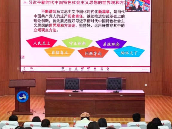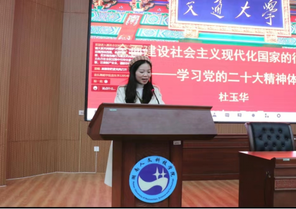 杜玉华教授主要从三个方面对党的二十大精神进行详细解读。一是分析党的二十大精神学习文本的结构框架,学习文本为“总-分-总”结构框架,始终围绕着全面建设中国特色社会主义现代化国家的总目标,报告分十五个方面详细阐述,最后报告号召全党全军全国各族人民为全面建设社会主义现代化国家、全面推进中华民族伟大复兴而团结奋斗;二是提出了“两个行”和“两个结合”,强调坚持和发展马克思主义必须和中国具体实际相结合、同中华优秀传统文化相结合;三是关于二十大精神的学习建议,指出青年学子应以二十大文本内容为主,联系生活实际,与其他会议精神进行比较分析,从而加深对二十大精神的理解。