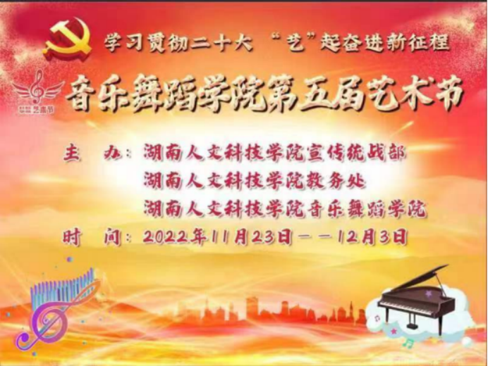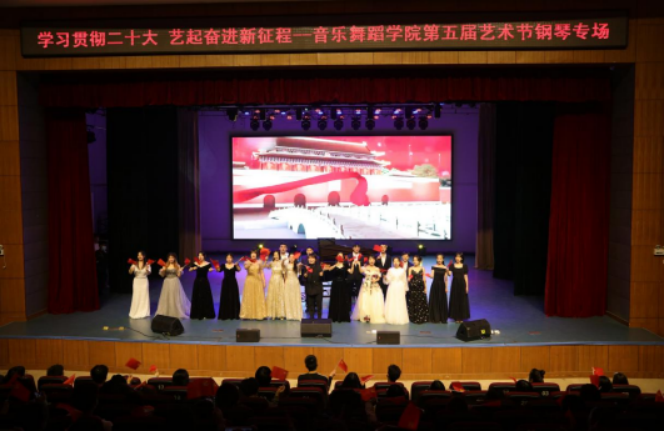 为深入学习贯彻二十大精神,进一步丰富学生的校园文化生活,激发学生的舞台表演积极性,提高学生的艺术实践能力,11月23日——11月29日,音乐舞蹈学院在音乐厅成功举办“学习贯彻二十大 ‘艺’起奋进新征程”第五届艺术节。