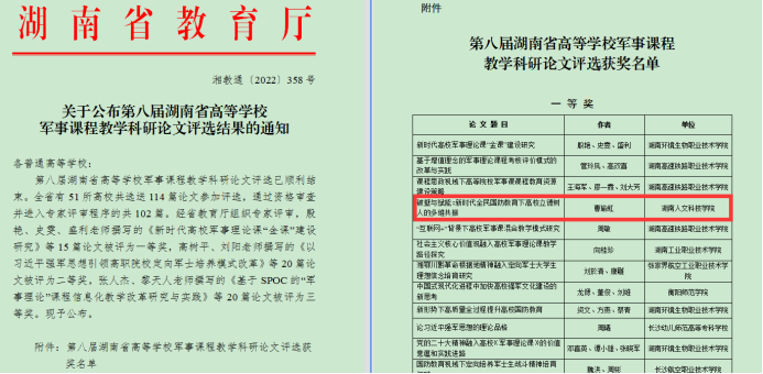近日,湖南省第八届高等学校军事课程教学科研论文评选结果公布,KY官网外国语学院曹瑜虹老师撰写的论文《破壁与赋能:新时代全民国防教育下高校立德树人的多维共振》荣获一等奖。