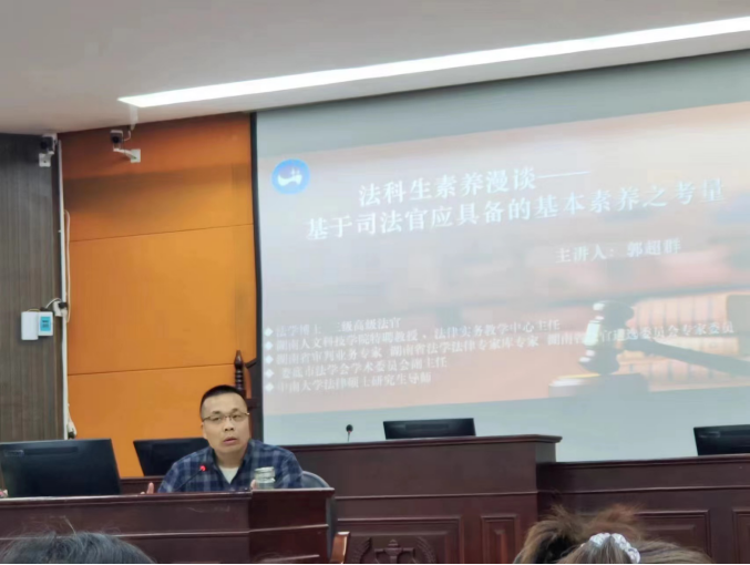 2月23日晚,娄底市中级人民法院高三级法官郭超群以“法科生素养漫谈——基于司法官应具备的基本素养之考量”为主题为法学院法学专业的同学们上了精彩生动的第一课。郭法官结合大量案例,以案释法,深入浅出地讲解司法官应具备的基本素养等内容。郭法官深厚的法学功底和丰富的实务经验让课堂内容精彩纷呈,引人入胜,赢得了同学们的一致赞许。