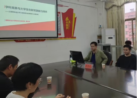 4月14日下午,湖南农业大学机电工程学院副院长莫亚武在同德楼306会议室作“学科竞赛与大学生创新实践能力培养”专题讲座。讲座由副院长伍铁斌主持,学院领导班子、学科竞赛指导老师以及有意参加学科竞赛的学生参加讲座。