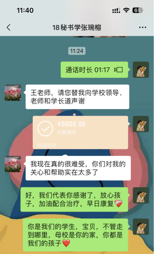受赠人张琬榕是文学院2022届校友,毕业工作未满一年,家庭经济困难。学院在得知她罹患癌症求助后,院党政班子带头募捐,并第一时间拟订募捐倡议,在学院、学校师生中广泛开展了募捐活动,希望通过爱心给她送去希望和信心。(撰稿人:王坤萍;一审人:赵嘉乐,王文静,二审人:毛永宁,三审人:尹钟宏)
