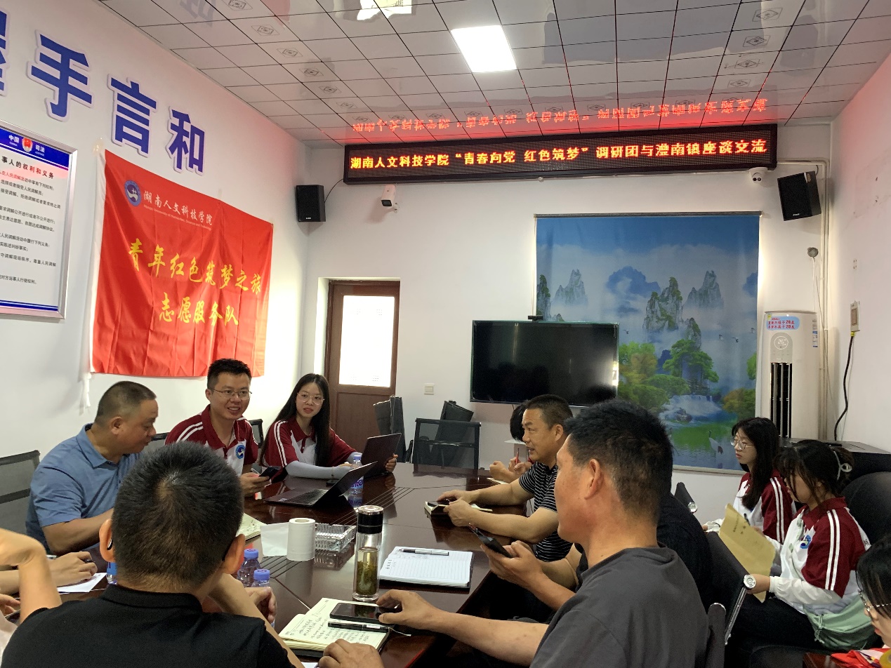 座谈会由澧南镇乡村振兴办主任高青主持,澧南镇镇长张杰、党委副书记彭庸、乡村振兴办主任吴俊清、彭坪村村支部书记彭传清、仙峰村村支部书记刘章生、马克思主义学院院长张卫明、团总支书记周浩、李婉溶老师以及全体调研团成员参会。