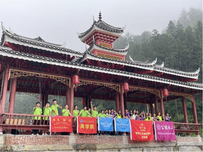 交流过程中,社会工作专业实践团队成员给商学院“遇见‘梅’好”队介绍了佘家村的风土人情及当地红色文化,分享了团队在佘家村开展的“乡村振兴”、“护航花蕾 守护花开”等实践活动所获得的经验。商学院“遇见‘梅’好”队也分享了在赖梅村开展的实践活动,并交流了相关的实践经验。在交流后,两队队员在佘家村的风雨桥进行了旗帜互换仪式。双方队员都希望未来可以一起开展更多志愿服务,共同为绥宁县苗乡侗寨的建设增砖添瓦。