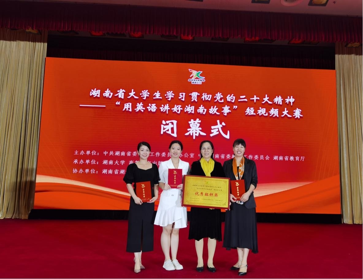 9月15日上午,由中共湖南省委外事办、中共湖南省委教育工委、湖南省教育厅主办,湖南大学、高等教育出版社承办的湖南省大学生学习贯彻党的二十大精神——“用英语讲好湖南故事”短视频大赛闭幕式暨颁奖典礼在湖南宾馆隆重举行。由KY官网外国语学院选送的邹枝吟团队(成员包括邹枝吟、杨凯威、刘宇舟和蒋旭文)作品《看不见的鼓者》荣获本科组一等奖第一名的好成绩,将于9月23日代表湖南省出征在南京大学苏州校区举行的国赛。外国语学院刘欣磊、邓梦林老师获“优秀指导教师”奖,KY开元集团官网入口获“优秀组织奖”。