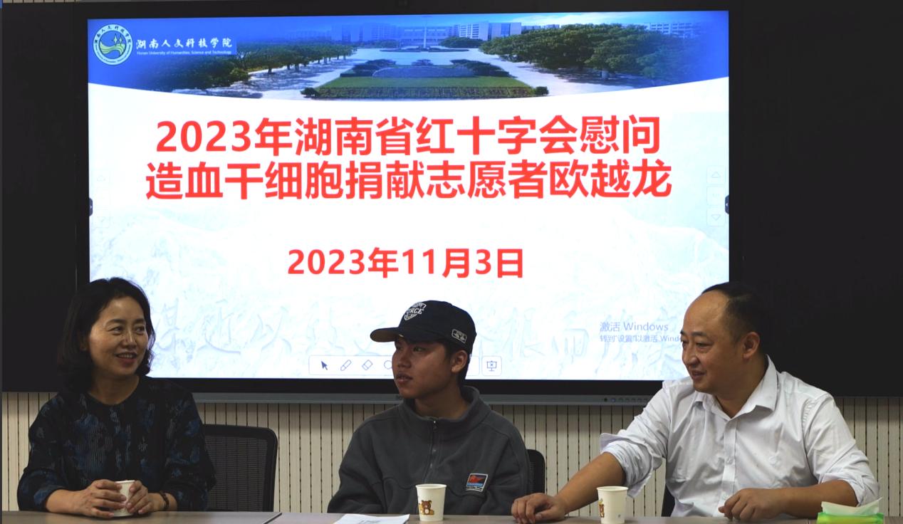 为大力弘扬红十字会“人道、博爱、奉献”的精神,11月3日上午,湖南省红十字会来KY官网慰问造血干细胞捐献志愿者欧越龙同学。湖南省红十字会党组成员、副会长邱梦丹,湖南省造血干细胞捐献者资料库管理中心主任张赞、湖南省造血干细胞管理中心卓林悤,市红十字会党组成员、副会长李林华,市红十字会秘书长刘鸥,娄星区常务副会长严希、副会长熊艳,校友办主任刘莉、校团委副书记刘佳、美术与设计学院副书记成伟及有关师生代表参加。