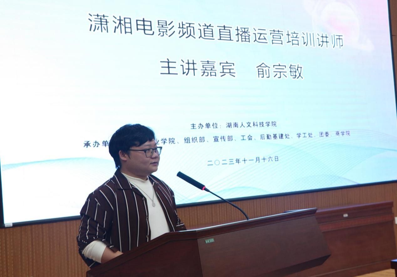 培训会特邀潇湘电影频道直播运营培训讲师、抖音全站运营师俞宗敏为参赛选手分享直播话术、流量机制操作经验。俞宗敏从底层逻辑、直播话术、产品培训、流量机制操作等方面分享直播带货营销经验,讲解专业细致,给师生们提供了满满的“干货”。培训后,俞宗敏还与学生们互动交流。