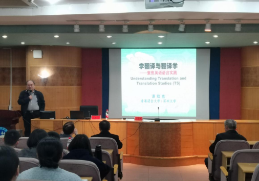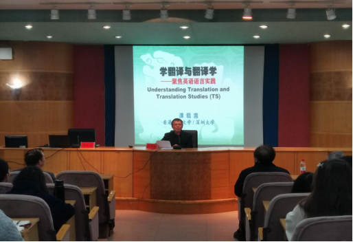 4月10日下午,知名学者谭载喜教授应邀在养根楼报告厅为外国语学院学生做了一场题为“学翻译与翻译学--聚焦英语语言实践”的学术讲座。谭载喜教授是香港浸会大学荣休教授,深圳大学外国语学院名誉教授及北京外国语大学讲席教授、博士生导师。讲座由外国语学院学术委员会主任丁志斌教授主持、外国语学院老师及学生共计180余人参加了此次讲座。