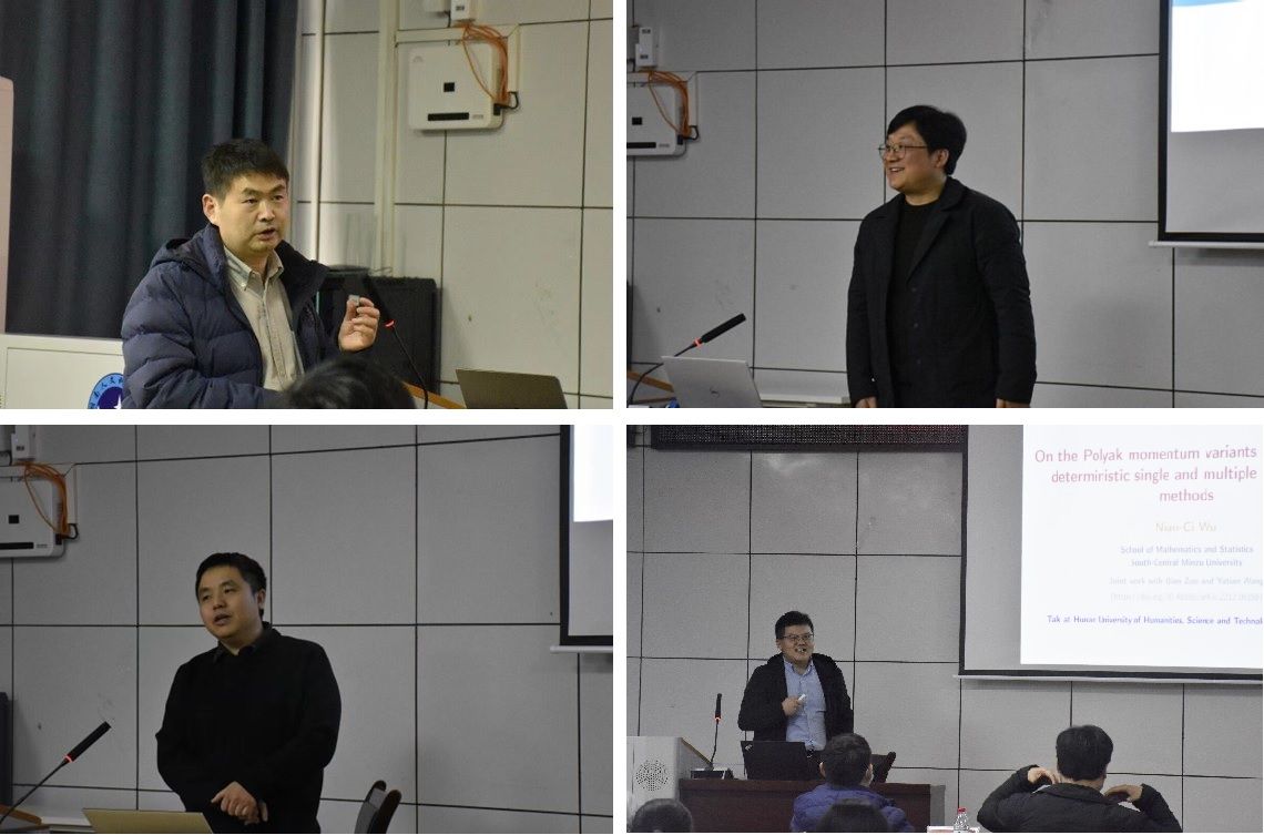 会上,蔺宏伟作题为《计算机辅助拓扑设计》的报告,介绍了持续同调的基本理论,并利用持续同调系统研究几何设计和几何处理中的拓扑问题。刘圣军以《物理信息启发的图形图像处理方法研究》为题,分享了传统数学理论与深度神经网络架构相结合的研究方法,并在图像图形处理问题中的应用。刘新儒作题为《图像超分辩技术及其在气象要素降尺度上的研究与应用》的报告,阐述了图像超分辨率方法在气象数据处理中的前沿研究。吴念慈以《贪婪确定性单行和多行作用方法的Polyak动量形式》为题,在确定性计算方法中引入Polyak动量以提升算法的计算效率。特邀报告结束后,与会人员围绕报告内容展开深入讨论。