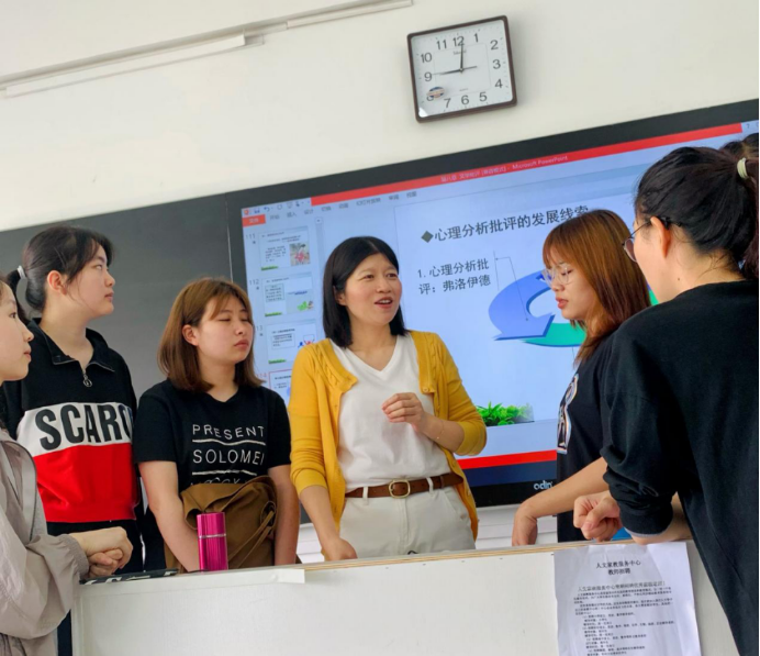 在教学方法上,彭老师反对“满堂灌”的方式,她乐于让学生提出自己的见解和看法。许多同学都表示,“彭老师常常鼓励我们独立思考和表达,上完彭老师的课,我觉得自己分析问题的能力有了很大的提升。”尽管彭老师的课堂很受学生欢迎,但是,彭老师从不满足,而是在教学改革的路上不停探索,永不松懈。2015年,她制作的微课作品《从“方韩大战”看媒介文学事件》获湖南省首届微课大赛二等奖。2017年,为了扎实推进 “马工程”重点教材的统一使用工作,彭老师又以此为契机,主持省级教学改革项目“马工程重点教材使用背景下文学理论教学改革”,将教材优势转化成教学优势,身体力行推动马克思主义文学理论中国化的最新成果,进教材,进课堂,进学生头脑。习近平总书记大力倡导推进课程思政建设后,彭老师也积极投入其中,深入挖掘专业课程中蕴含的思政元素,主持湖南省课程思政建设项目“基于马工程教材使用的《文学理论》课程思政探索与实践”,以实践行动落实立德树人的根本任务,并取得了不错的成效。