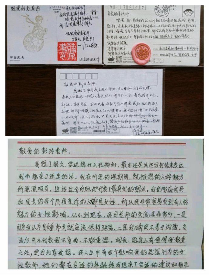 彭老师主要担任《文学理论》《中国文化概论》两门课程的教学工作,在教学过程中,彭老师会结合课程特点,引导学生关心国事民瘼。她常常对学生说,“大家以后一定要承担起一个大学生应有的社会责任,潜心投身于教育、学术、文化等事业,积极地服务于社会。”在她的影响下,无数文学院的学子,毕业后走在中小学教育的第一线;有的学生,甚至奋斗在贫困地区教育的第一线。他(她)们将爱的种子,播撒在祖国各地。