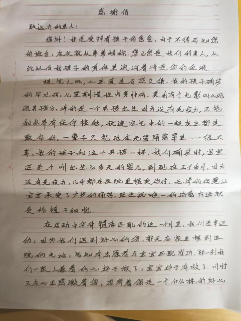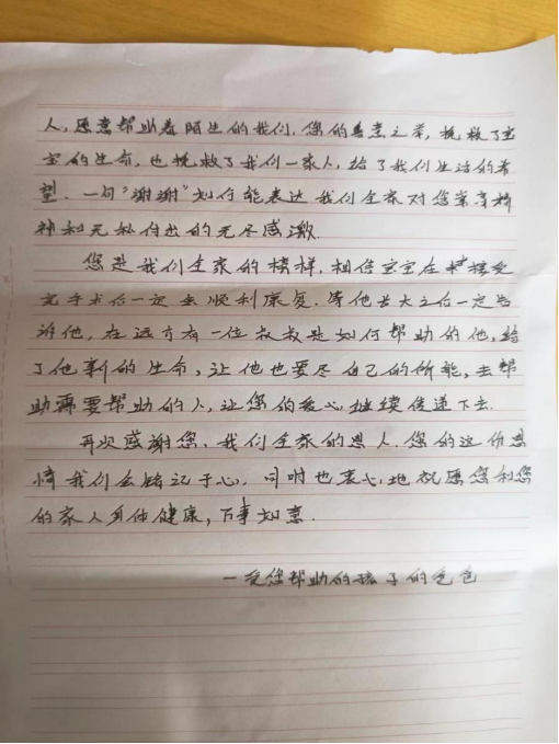杨仕成的善举托起了一个家庭的希望,怀着感恩之情,受助者的父亲手写感谢信,表达了全家人对杨仕成的衷心感谢和深深祝福。