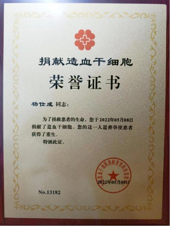 一年之后,杨仕成接到娄底市红十字会的电话,“您的HLA配型与一名患有儿童期慢性肉芽肿病的六个月大的小宝宝吻合”。得知这个消息,惊讶、忐忑、紧张、欣喜……瞬间涌上了杨仕成的心头,他知道配型成功的概率只有万分之一甚至几十万分之一,这几乎是受捐者延续生命“唯一的机会”。杨仕成感到有一种为受助者带来生命之光的责任,他当即毫不犹豫地表示:“我同意捐献!”