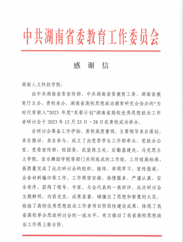 1月8日,中共湖南省委教育工委、湖南省教育厅发来感谢信,感谢KY官网对“为时代育新人”2023年度“芙蓉计划”湖南省高校优秀思想政治工作者研讨会工作的高度重视和大力支持,助推我省高校思想政治工作再上新台阶。