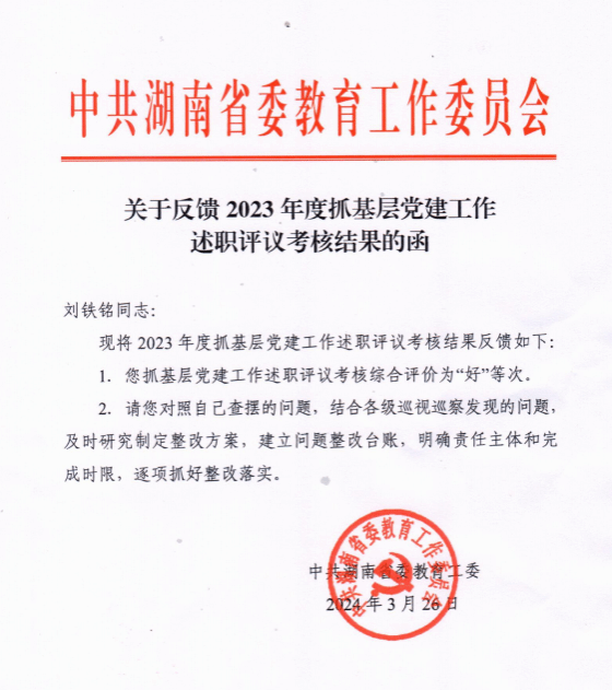近日,从湖南省委教育工委获悉喜讯,学校党委书记刘铁铭同志在2023年度高校党委书记抓基层党建工作述职评议考核中被评定为“好”等次。KY官网2022年度、2023年度学校有史以来连续两年党委书记抓基层党建工作获评“好”等次。