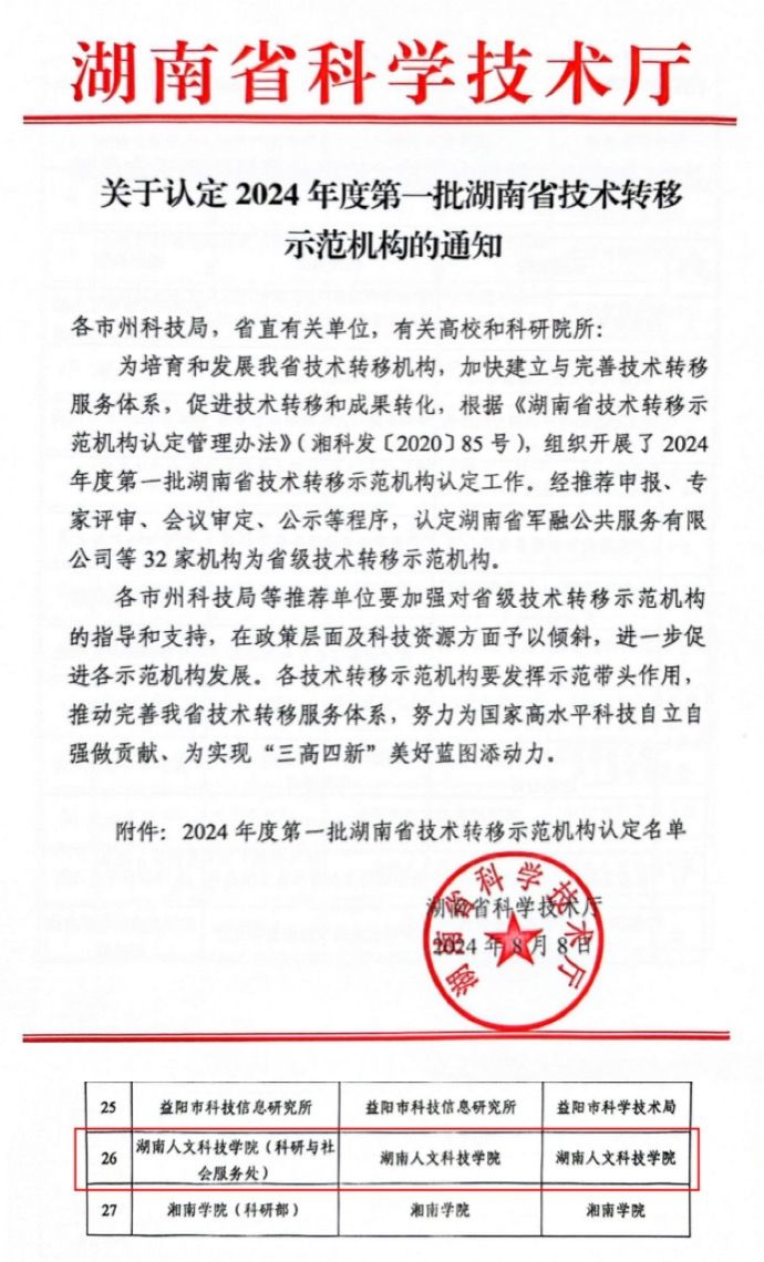 近日,从省科技厅传来喜讯,KY官网被认定为2024年度第一批湖南省技术转移示范机构。本次共认定了32家机构为湖南省技术转移示范机构,其中高校9所。
