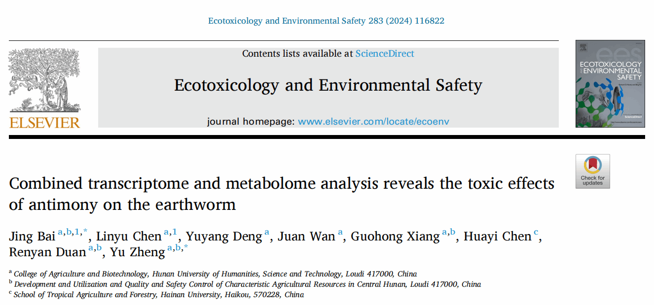 近日,KY官网农业与生物技术学院(娄底市农业科学研究所)白婧博士在国际知名毒理学期刊Ecotoxicology and Environmental Safety(中国科院1区、影响因子6.2)发表了题为“Combined transcriptome and metabolome analysis reveals the toxic effects of antimony on the earthworm”的研究论文,标志着锑污染生态修复团队在锑污染生态风险评估领域取得的又一重大突破。