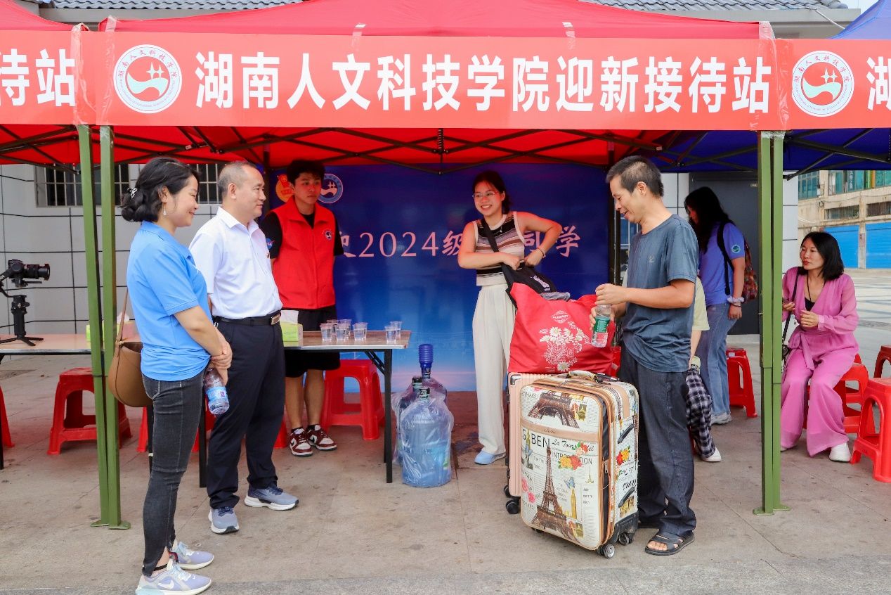 在娄底高铁南站迎新点休息等候区,盛明科热情地与新生及家长们交流,了解他们的家乡背景、兴趣爱好以及对大学生活的期待,并现场为大家答疑解惑。他鼓励新生们要勇于探索、积极进取,尽快融入大学生活,提升自我,不负大学美好时光。盛明科还慰问了参与迎新工作的师生志愿者,强调要密切配合、通力协作,用心用情服务好每一位新生和家长。