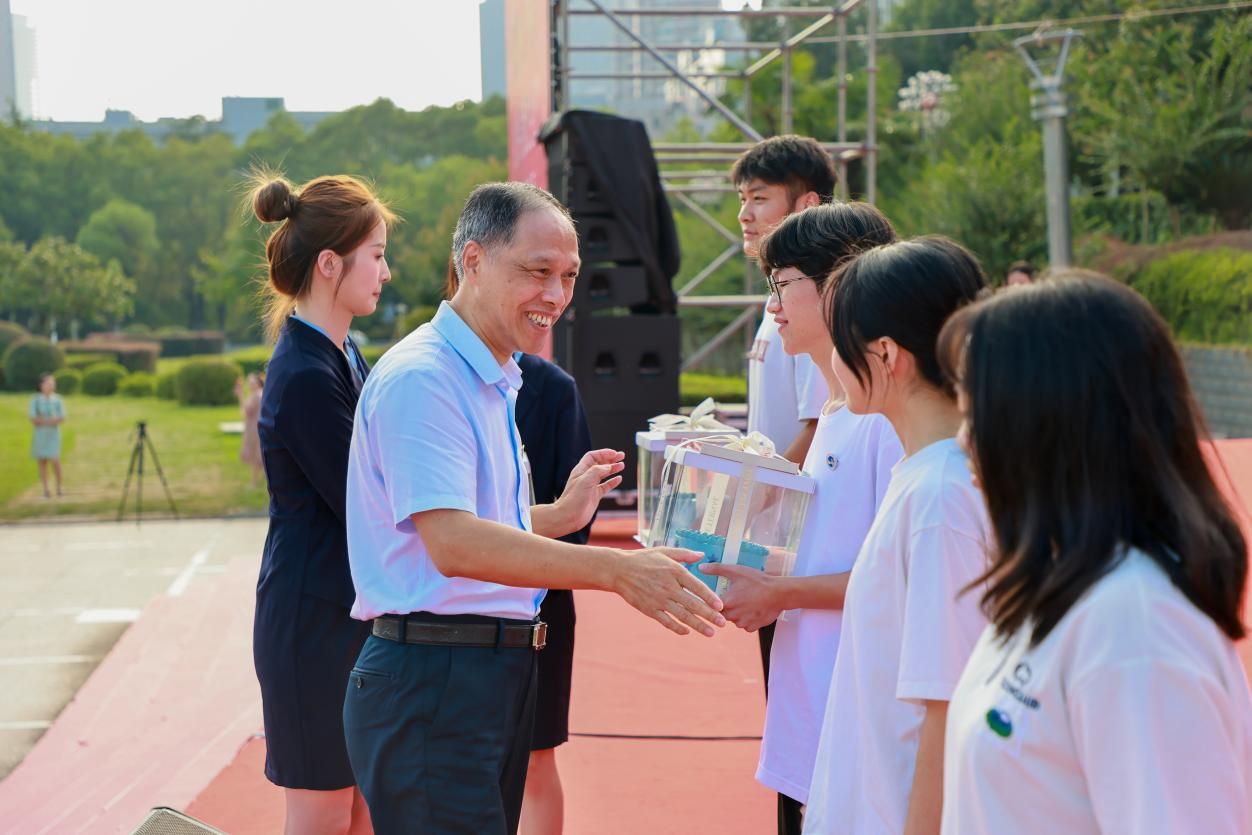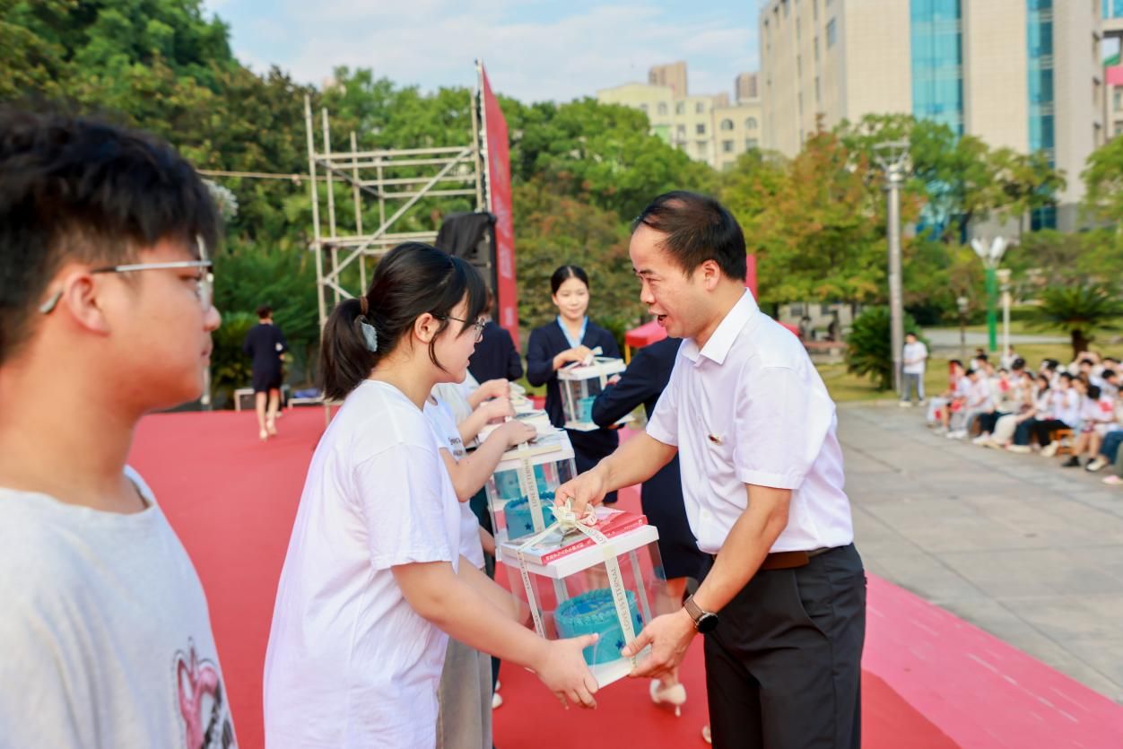 党委书记刘铁铭和校长盛明科向当天生日的12名新生送上祝福,赠送了蛋糕和书籍《习近平与大学生朋友们》作为生日礼物。