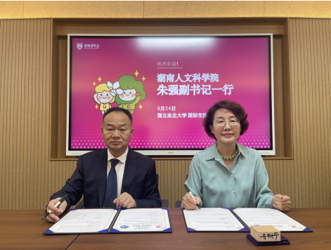 9月23日至26日,校党委副书记朱强率团出访韩国。期间,代表团访问韩国国立忠北大学,调研韩国SOD株式会社植物提取深加工项目,访问考察韩国茶美家株式会社、韩国美丽健康产业协会等企业,看望韩国国立忠北大学娄底籍学生代表以及在首尔求学的湘籍学生代表。数学与金融学院、音乐舞蹈学院、科研与社会服务处、国际交流处负责同志随团出访。