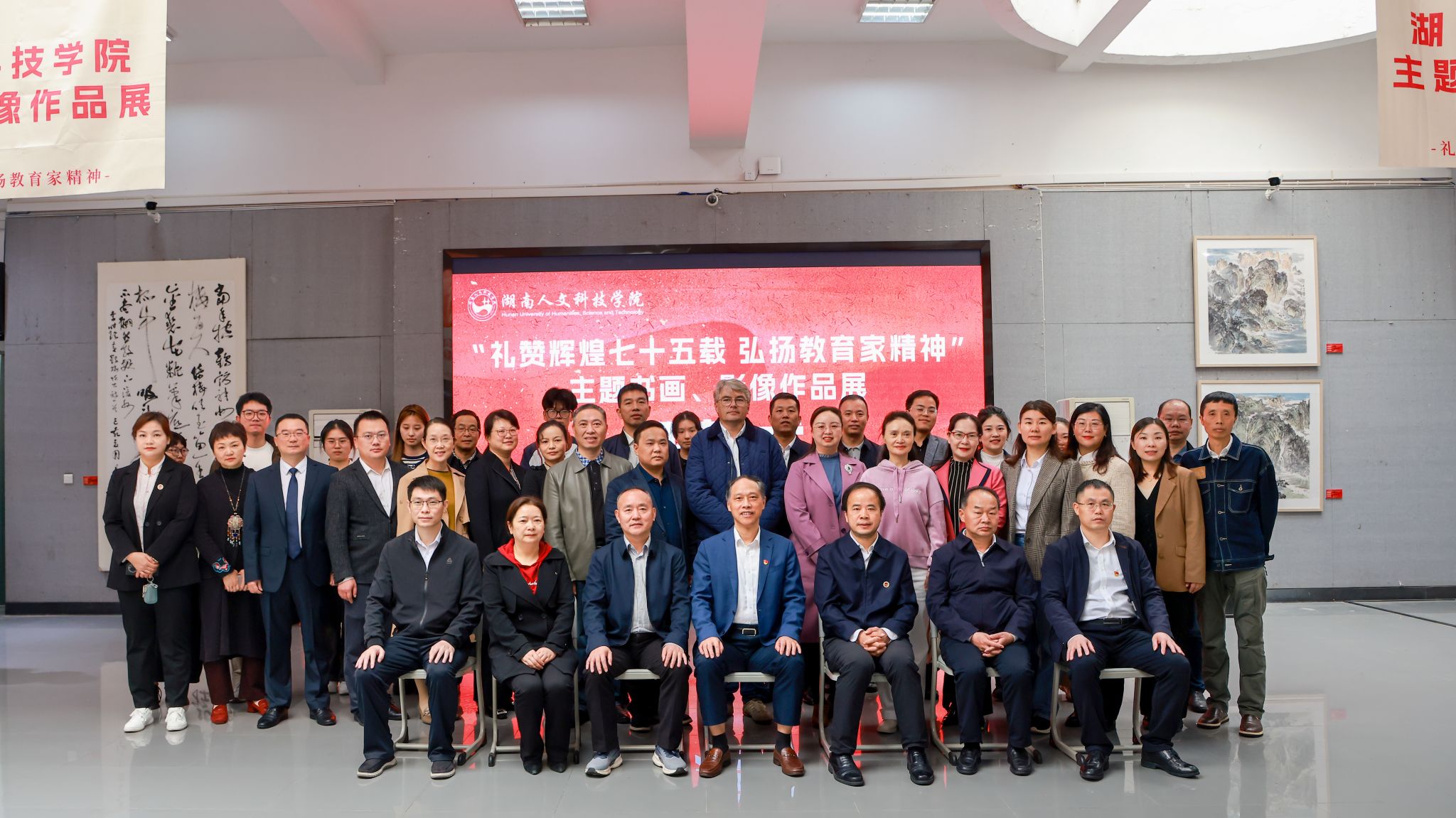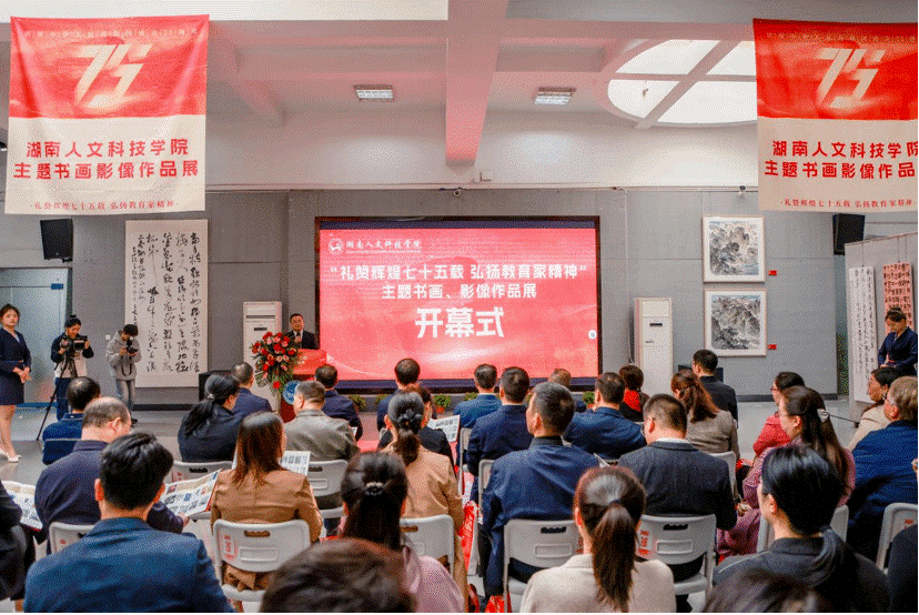 丹青吐彩、翰墨怡情。10月28日上午,由学校党委宣传部、学校工会联合主办,美术与设计学院承办的“礼赞辉煌七十五载 弘扬教育家精神”主题书画、影像作品展在学校逸美楼展览厅开幕。全体在家校领导出席,开幕式由美术与设计学院党总支书记阳立新主持。
