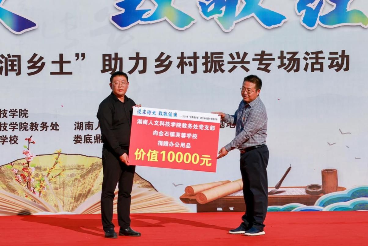 活动在民乐合奏《小满》中拉开序幕。本次活动共为观众呈现了十个节目,节目类型有散文朗诵、诗歌朗诵、民乐合奏、京胡独奏,以及歌曲演唱等,表演者们精彩的演绎令观众深深陶醉,节目间隙的“飞花令”互动环节更是吸引了现场众多同学的参与。活动现场,KY官网教务处党支部向金石镇芙蓉学校捐赠价值10000元的办公用品,以实际行动关爱乡村青少年成长,助力乡村振兴。