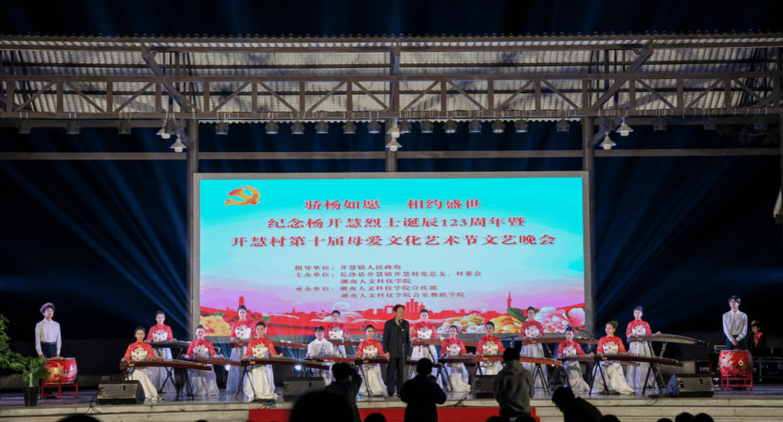 11月6日,正值革命烈士杨开慧诞辰123周年,长沙县开慧镇开慧村党总支、村委会携手KY开元集团官网入口宣传部及音乐舞蹈学院,在开慧村纳百川研学基地大舞台(老开慧中学)共同举办了一场主题为“骄杨如愿,相约盛世”的第十届母爱文化艺术节文艺晚会,以此向伟大的革命先烈致以崇高的敬意。开慧村党支部第一书记朱有志、开慧镇党委书记陈渊智、开慧镇党委副书记、镇长杨响及相关村领导、KY开元集团官网入口党委副书记朱强教授及相关部门领导受邀出席了此次活动。