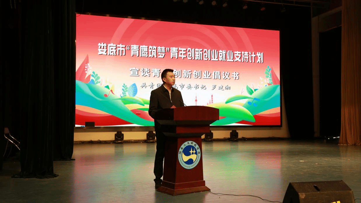 (娄底市委副书记、市委政法委书记蒋天海讲话) 团市委书记罗建湘对广大团员青年发出《青春之城·奋斗逐梦》的倡议书,动员广大青年积极投身创新创业行动。