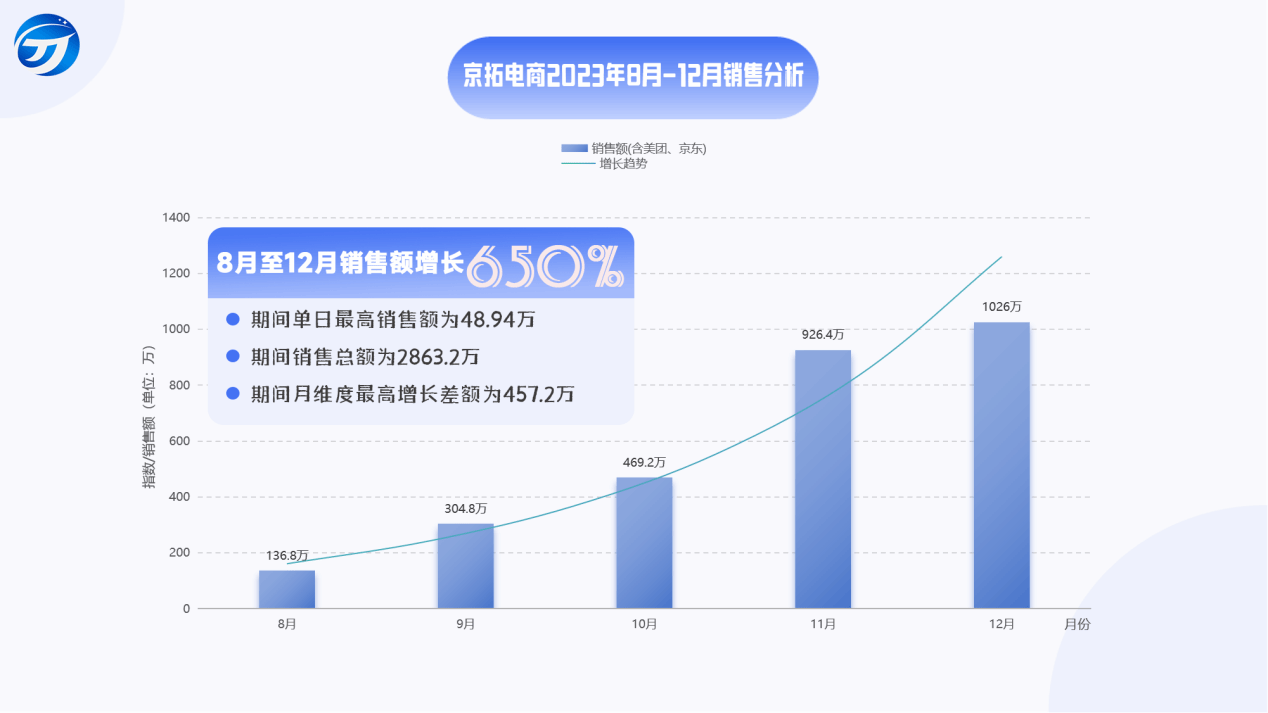 这套“外科手术级”方案,在2023年8-12月缔造销售额2863.2万、单日峰值48.94万的佳绩。当同行深陷流量内卷时,京拓已为合作伙伴筑起“数据护城河”——AI驱动的“黄金详情页生成器”让转化率飙升22%;“价格热力引擎”动态调价响应速度超越平台算法0.3秒。