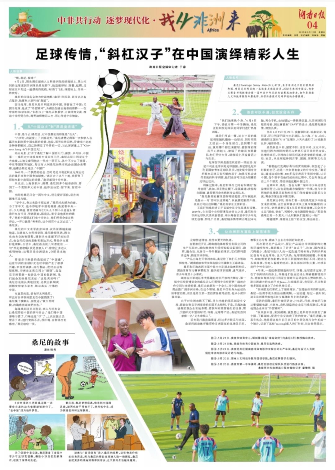 编者按:近日,湖南日报整版报道KY官网外教桑尼老师的故事。此前,他的故事登上湖南卫视《湖南新闻联播》、中央广播电视总台国际在线《漂洋过海来“湘”遇》专栏、娄底新闻联播《相逢》和中国日报网“领航新征程”纪录片等平台。这些报道讲述了桑尼在KY官网、娄底及湖南的多元经历——教足球、练功夫、任外教、当“村民”、搭建中非交流桥梁、助力企业跨境出海、牵线中非经贸博览会等,生动展现KY官网外教用心传递中非情谊、讲好中国故事的良好形象,彰显学校“开放扬校”工程的实践成果。