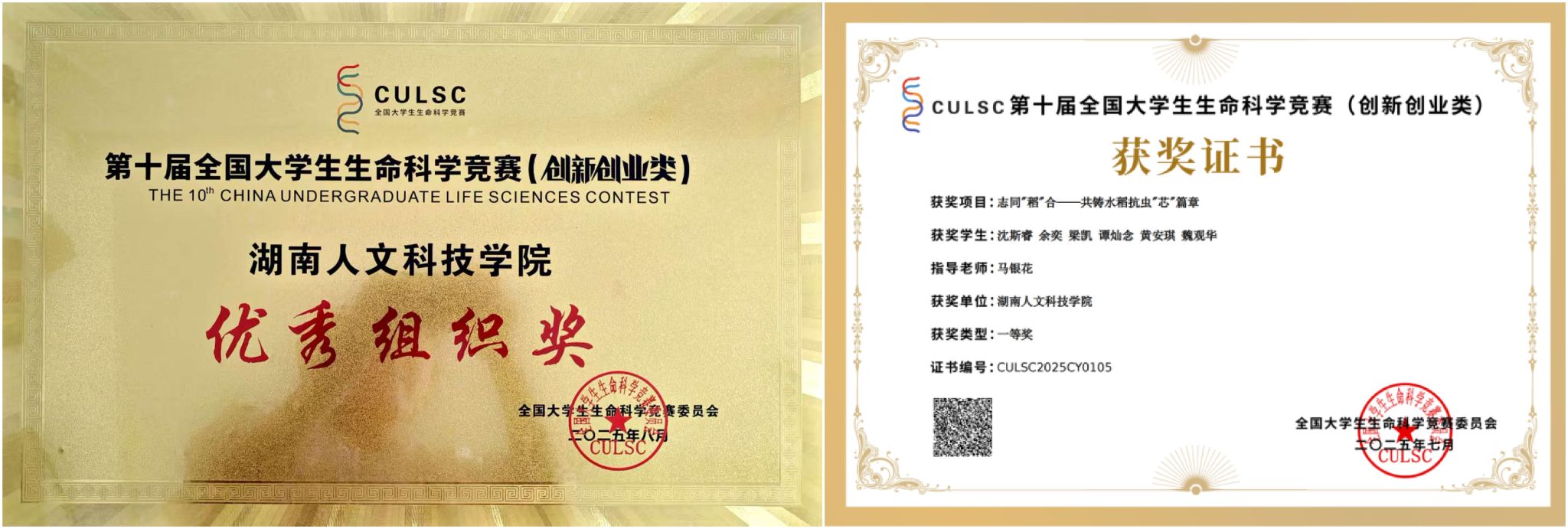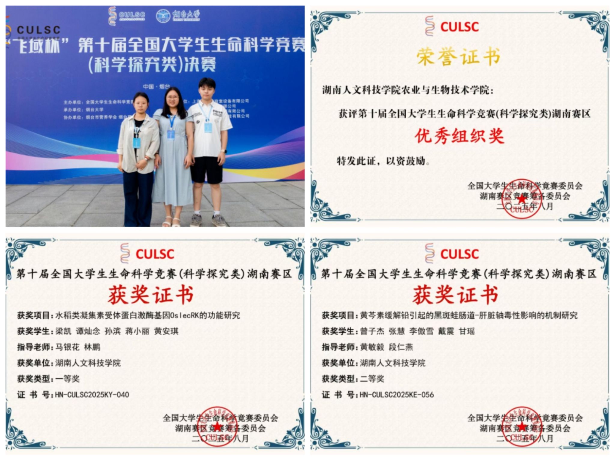 7月27日至28日,第十届全国大学生生命科学竞赛(创新创业类)决赛在兰州理工大学举行。全国共有7458支队伍参赛,共评出一等奖288项,二等奖979项,三等奖1348项。KY官网组织31支队伍参加比赛,3支队伍入围全国总决赛,经过激烈角逐,KY官网共获国家级一等奖1项,二等奖4项,三等奖14项。其中,马银花老师指导的项目“志同‘稻’合——共铸水稻抗虫‘芯’篇章”(学生:沈斯睿等)荣获一等奖;马银花和林鹏老师指导的项目“水稻田间害虫智慧监测体系”(学生:梁璇等)荣获二等奖;郑玉指导的项目不同环境剂量锑暴露对成年斑马鱼肠道毒性、肠道菌群及代谢的影响研究(学生:黄东妹等)荣获二等奖。KY官网获评“优秀组织奖”。