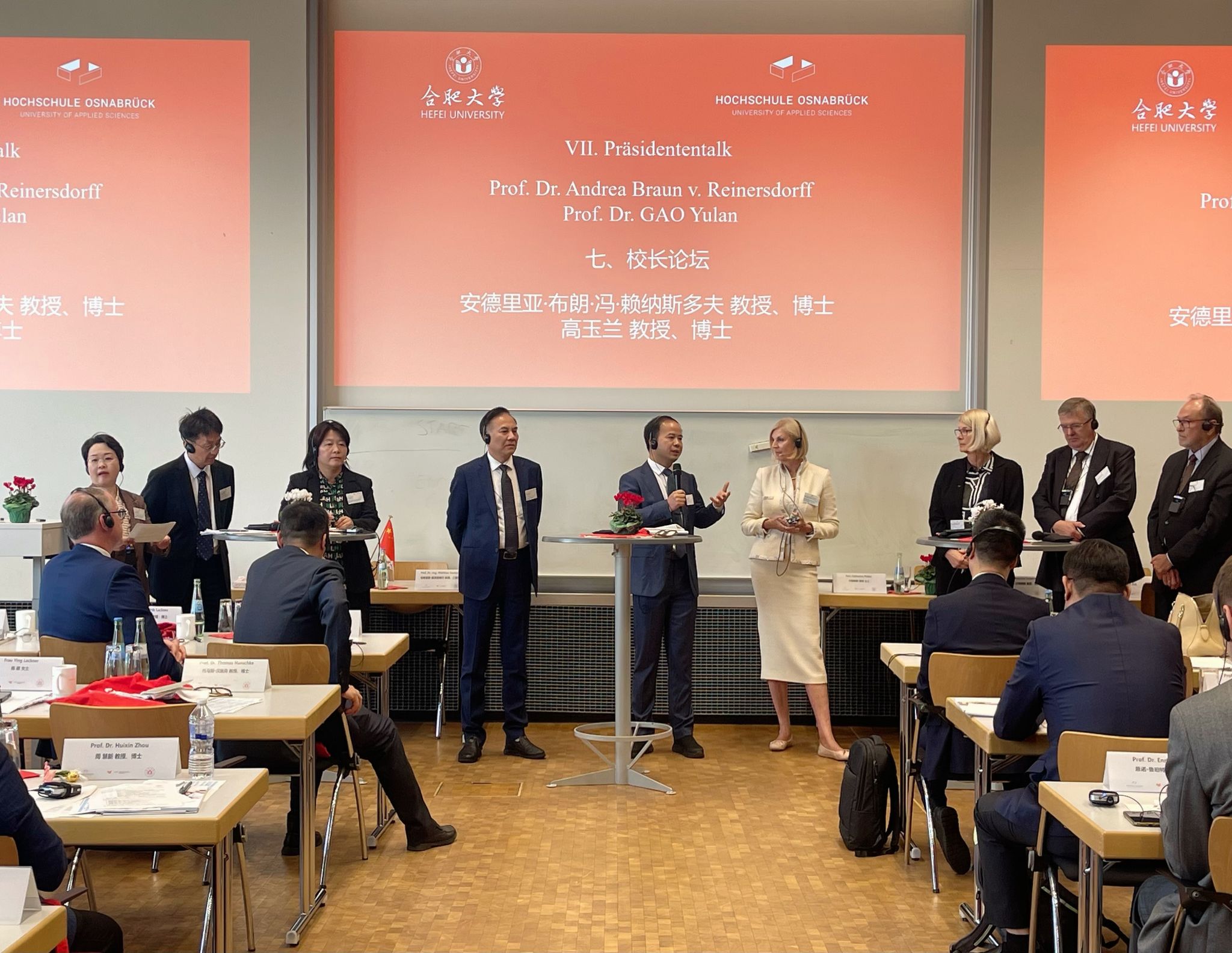 本次研讨会的主题为“高校与企业界创新联通的模式与成功要素”。开幕式和大会报告结束后,盛明科校长和比勒菲尔德应用科学大学校长英格博格·施拉姆-沃尔克、萨克森双元制应用科学大学前校长安德里亚斯·汉塞尔、湖南文理学院党委副书记李红革、克劳斯塔尔工业大学前校长托马斯·汉施克、蚌埠学院校长张亚新、施特拉尔松德应用科学大学前校长法尔克·霍恩、皖西学院党委副书记胡林娜以圆桌对话形式展开校长论坛,就中德两国如何深化校企合作、如何在应用型双元制学习模式中达成高效合作进行了深入探讨。校长论坛由奥斯纳布吕克应用科学大学经济与社会科学学院院长安德里亚·布朗·冯·赖纳斯多夫和淮北师范大学副校长高玉兰联合主持。