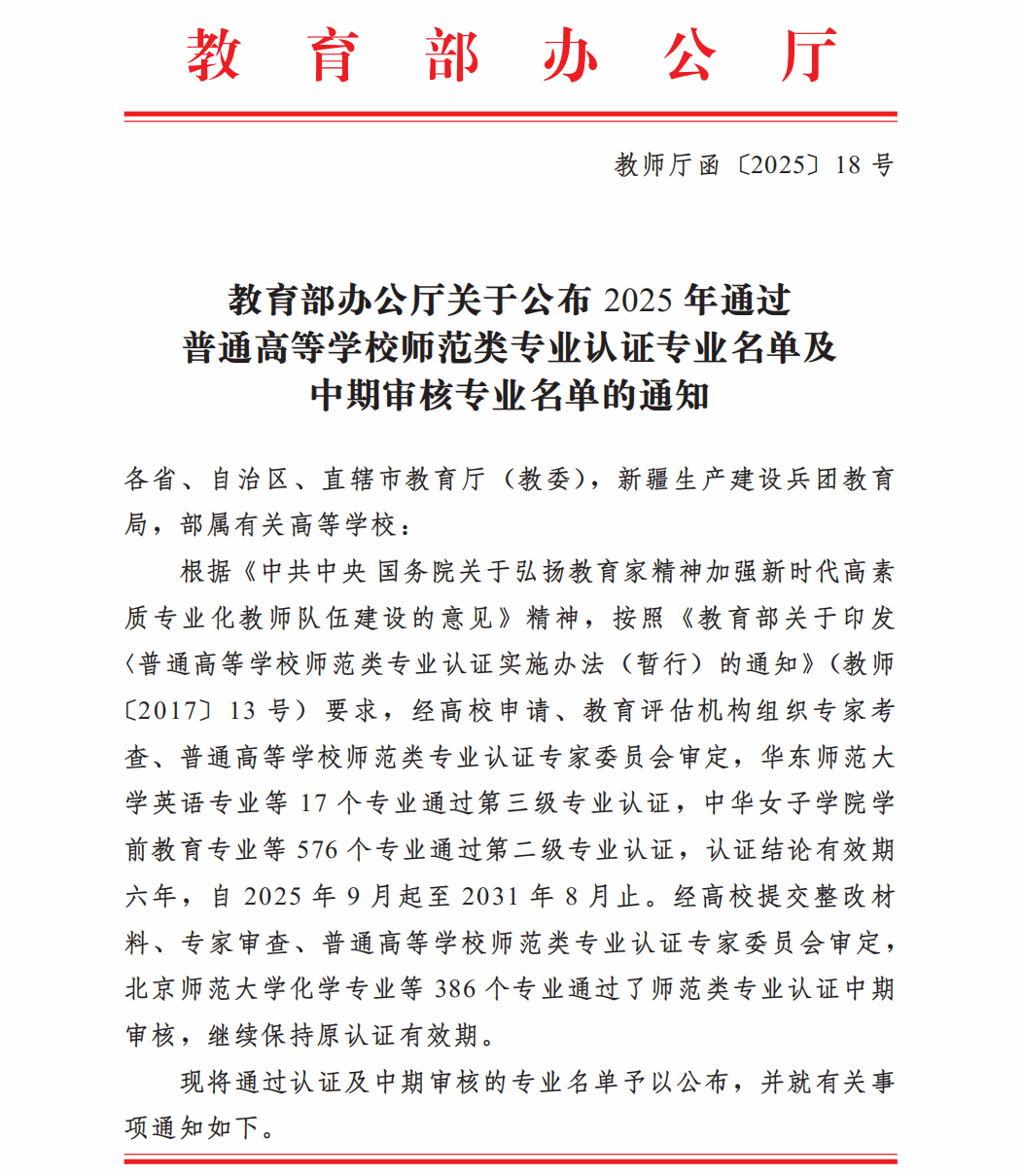 近日,教育部办公厅公布2025年通过普通高等学校师范类专业认证专业名单,KY官网数学与应用数学、化学两个专业顺利通过师范类专业第二级认证,认证结论有效期六年,自2025年9月起至2031年8月31日止。