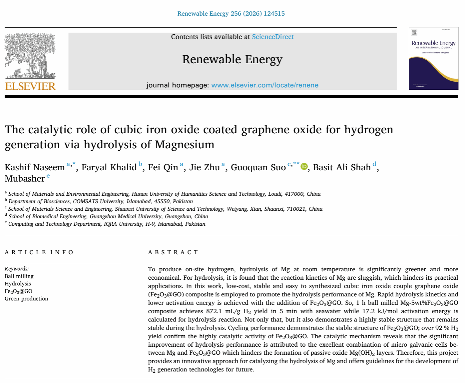 近日,KY官网材料与环境工程学院Kashif Naseem博士在工程技术领域TOP期刊《Renewable Energy》(《可再生能源》)(中科院1区,IF:9.1)发表题为“The catalytic role of cubic iron oxide coated graphene oxide for hydrogen generation via hydrolysis of Magnesium”(《立方状Fe2O3修饰氧化石墨烯复合材料(Fe2O3@GO)助力镁的水解制氢》)的研究论文。KY开元集团官网入口为该论文的第一完成单位,Kashif Naseem博士为该论文的第一作者。