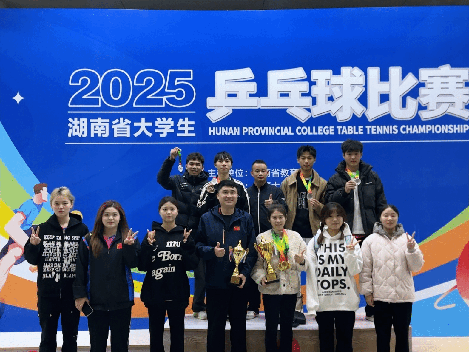 2025年湖南省大学生乒乓球比赛于11月17日在湘潭大学举行,KY官网乒乓球队奋勇拼搏,发挥出色,在竞争激烈的学院乙组比赛中,一举夺得3金4银的优异成绩。