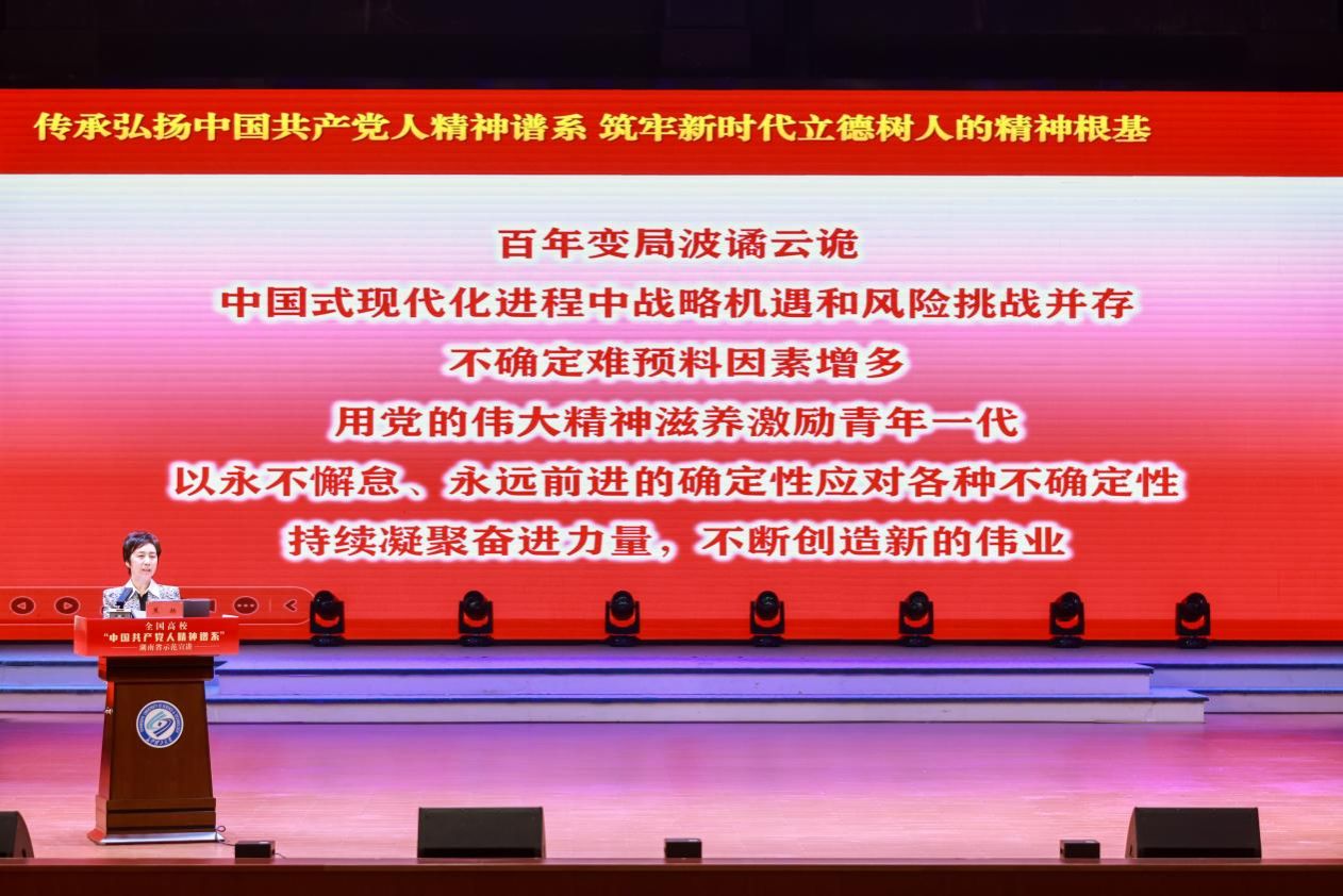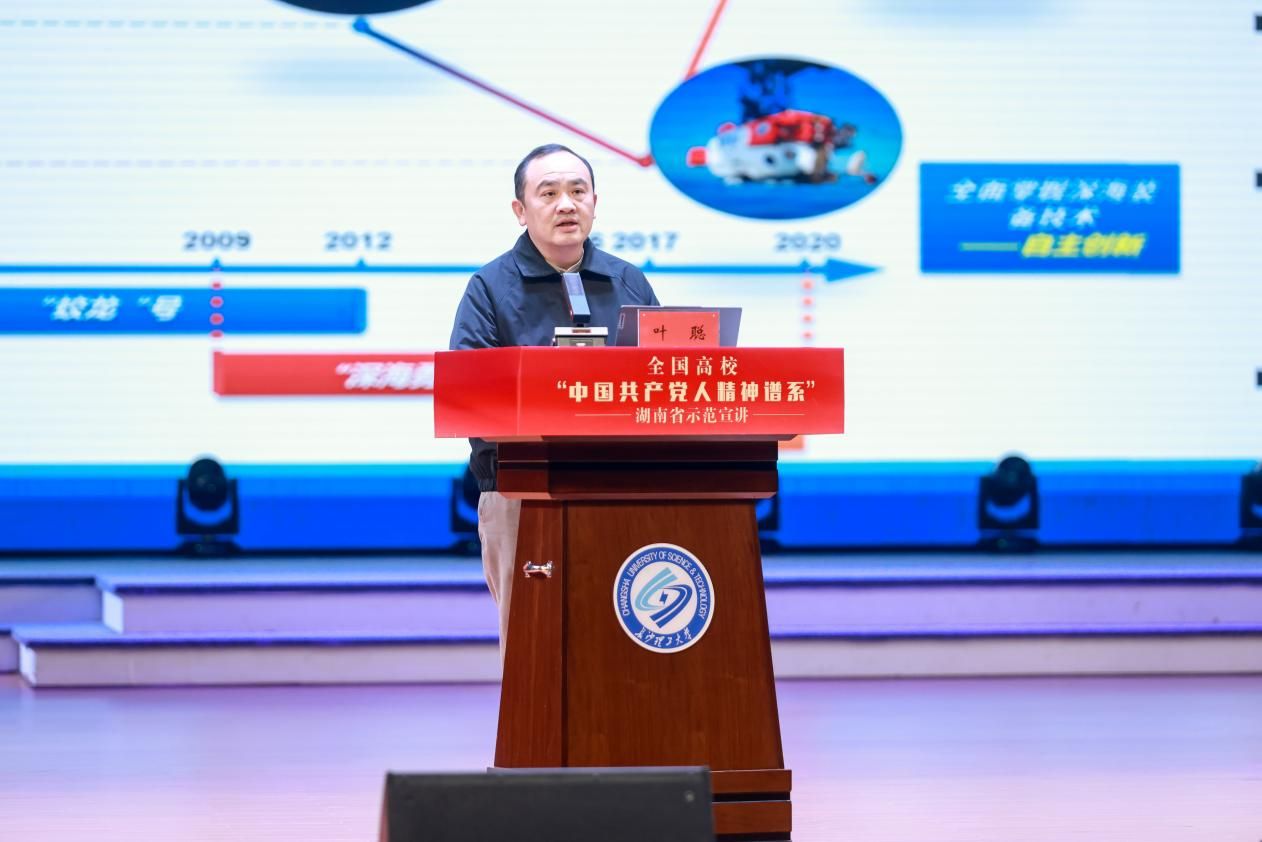 宣讲会上,中国船舶科学研究中心所长叶聪,以我国载人深潜事业从“蛟龙”号到“奋斗者”号的发展历程为脉络,生动诠释“严谨求实、团结协作、拼搏奉献、勇攀高峰”的载人深潜精神,彰显科技工作者的报国担当;湖南省“最美退役军人”刘欲求结合亲身经历,深情讲述军人不畏牺牲、忠诚卫国的初心使命,号召青年学子传承红色基因、勇担时代责任;复旦大学原党委书记焦扬系统阐述了中国共产党人精神谱系的历史源流、鲜明特征与核心内涵,深入分析了精神谱系在高校立德树人、培育时代新人中的重要意义与实践价值。