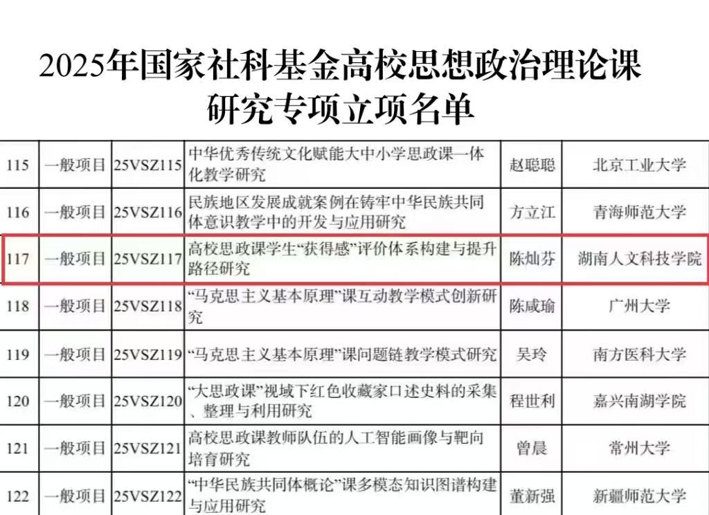 近日,全国哲学社会科学工作办公室公布了“2025年国家社科基金高校思想政治理论课研究专项立项名单”,KY官网马克思主义学院陈灿芬教授申报的《高校思政课学生“获得感”评价体系构建与提升路径研究》名列其中。