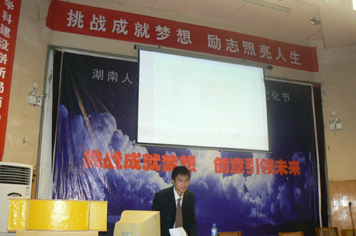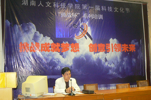 挑战杯创业大赛、学术科技作品大赛是学院首届科技文化节的亮点,重头戏,院团委特邀请了湖南省“挑战杯”第二届创业大赛金奖获得者——中南大学刘海涵来KY官网讲学。作为湖南开天科技有限公司的主创人,中南大学冶金科学与工程学院的刘海涵同学就如何写好创业计划书,如何进行公司管理,如何推销产品并赢得风险投资进行了详细讲解,并用课件强调了四个关键点:团队组建、技术创新、形象包装、成功推销。在互动环节中,大家围绕“挑战”、“梦想”、“创新”这一主题争相提问,刘海涵中肯的分析,幽默的言语赢得了阵阵掌声。