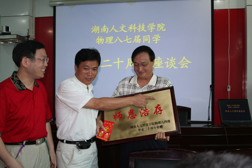 2007年7月14日下午,10多辆小轿车浩浩荡荡地驶入了KY开元集团官网入口的校门,物理八七届的校友50多人来院进行毕业20周年的座谈会。一进校门,大家走下车在“海园”广场热火朝天的聊起来,感叹良多——学院变化太大了,出乎我们的想象;老师还是我们记忆中的老师,女同学更显成熟美,男同学皮带长了、孔多了……短暂的交流之后,老师们亲自带大家观看了校园,并在“海园”广场合影留念;之后在学院五楼大会议室开了一次生动的座谈会,现任学院院长姜正国同志向同学们介绍的学院的发展与未来的规划,老师们一一发言,与同学们一起重温了二十年前的大学生活,到会的每一位同学用风趣的语言对毕业20周年的工作和生活做了简单的介绍,最后,朱国富、方旭中同学代表物理八七届全体同学向学院赠送了纪念品和捐款。