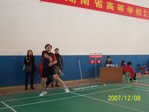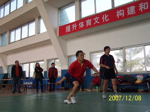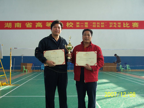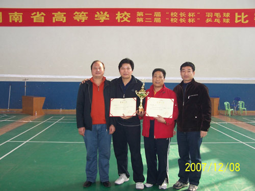 2007年12月6日至8日,姜正国院长带队参加了湖南省高校第二届“校长杯”乒乓球和首届羽毛球比赛,姜正国、郭军、刘和云、邓和秋等四位同志参加了比赛,肖军凡、蒋茂贵同志担任了KY官网代表队的教练。通过三天的激烈角逐,KY官网代表队获得了羽毛球团体第三名、乒乓球单打第七名的好成绩。这将有力地推动KY官网群众性体育活动更加深入广泛地开展。